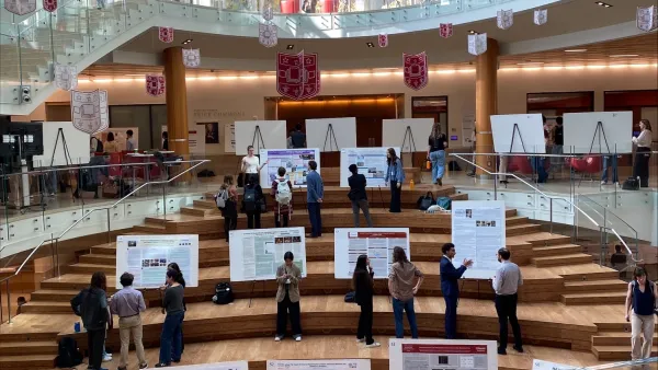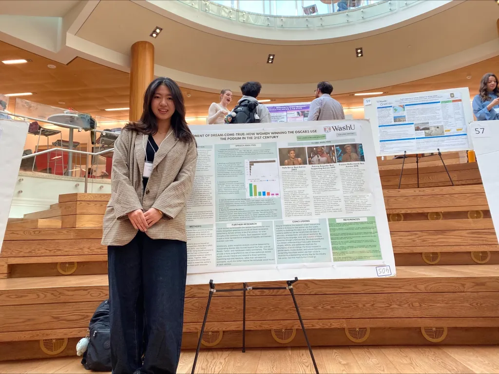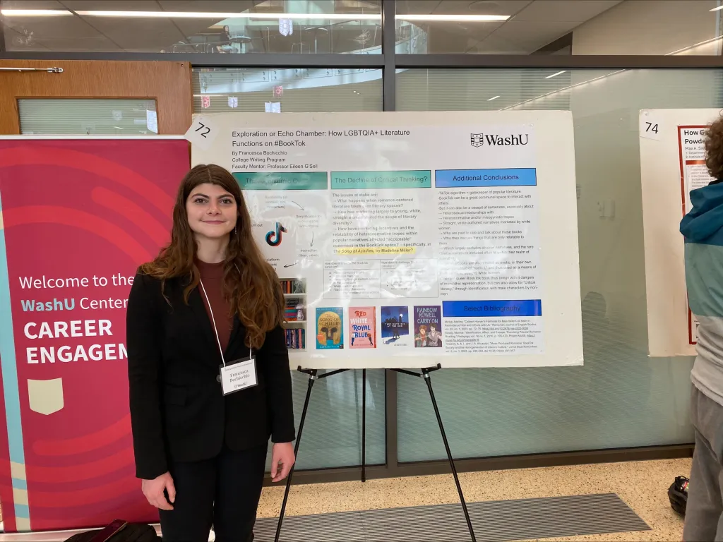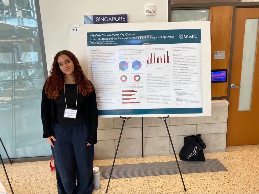 Three student research projects from College Writing were featured at the Office of Undergraduate Research’s (OUR) Fall 2025 Undergraduate Research Symposium that took place on Friday, November 7th in Bauer Hall. The event featured a wide array of research projects from undergraduate students from across the WashU community. Students had the opportunity to hone their presentation skills while sharing the excellent work that they have produced as College Writing students. Some students presented posters of their research, while other students engaged in brief oral presentations and Q&As about their work.